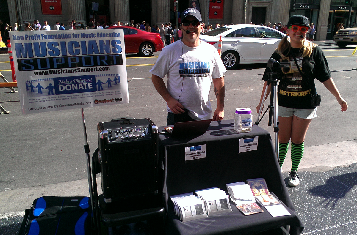 Founder/CEO Marc Bernal and volunteer T. Baird fundraising for music education at Hollywood and Highland.